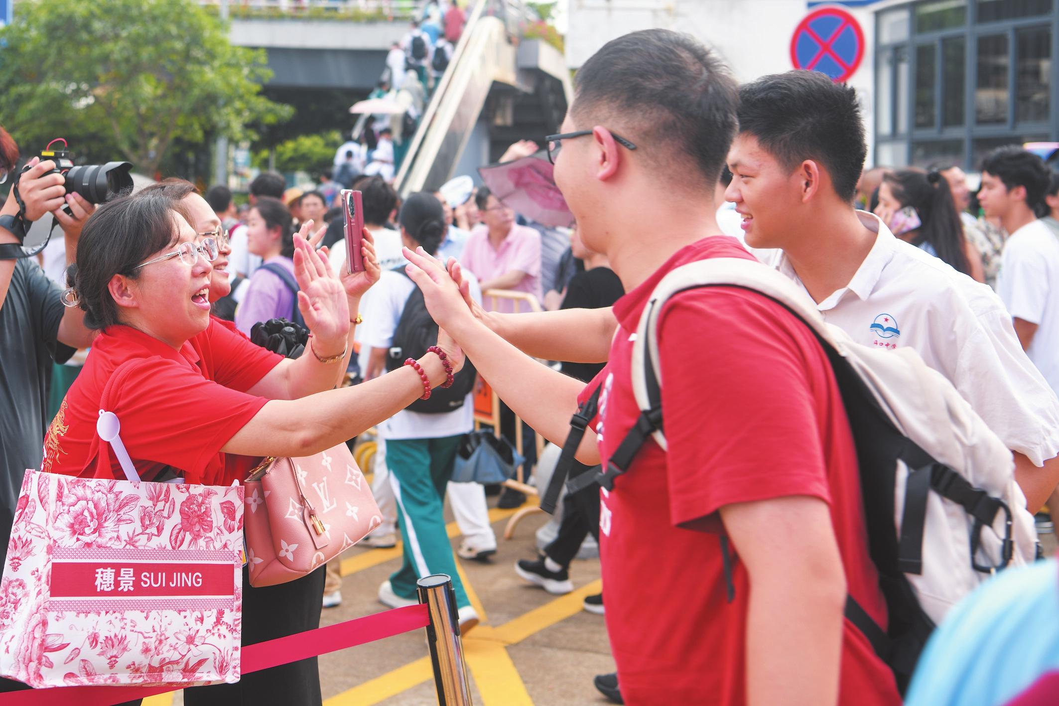 6月8日,在海南華僑中學高中部考點外,老師和走出考場的考生擊掌。記者 楊鶴 攝