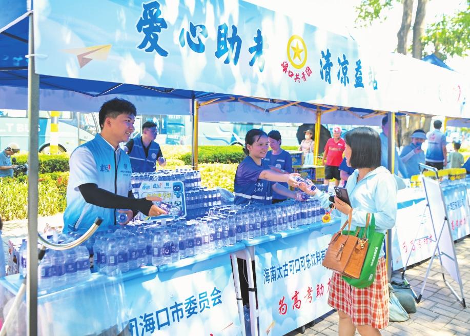 6月8日,在海口海港學??键c外,青年志愿者為考生家長送上飲用水。記者 石中華攝