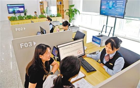 6月24日,安徽省淮南市政務(wù)服務(wù)大廳,企業(yè)代表在與工作人員交流。近年來(lái),該市持續(xù)打造集約高效的政務(wù)服務(wù)體系,推進(jìn)跨層級(jí)、跨區(qū)域的信息共享和業(yè)務(wù)協(xié)同,讓群眾實(shí)現(xiàn)“高效辦成一件事”。陳彬 攝(中經(jīng)視覺(jué))