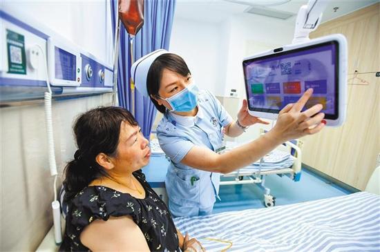 7月22日,江西省宜春市人民醫(yī)院護(hù)士在智慧病房向患者講解床頭交互系統(tǒng)的使用方法。當(dāng)?shù)卮罅ν七M(jìn)智慧醫(yī)院建設(shè),搭建互聯(lián)網(wǎng)醫(yī)院、遠(yuǎn)程醫(yī)療、智慧病房等平臺(tái),提升醫(yī)療質(zhì)量與工作效率。周亮 攝(中經(jīng)視覺(jué))