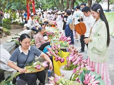 市集里,不少攤主是本地農(nóng)戶。每天清晨,年過七旬的沈秋云都會(huì)挑著自家種的荷花前來售賣;攤主張小蘭自稱“花老板”,在自家攤位前笑迎顧客……一個(gè)個(gè)普通農(nóng)戶在這里擺出小攤,售賣應(yīng)季的鮮花和農(nóng)產(chǎn)品,逐漸形成了頗有名氣的“荷花市集”。