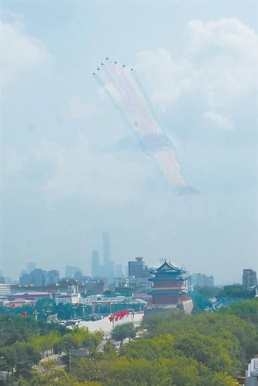 戰(zhàn)機編隊拉出的彩煙與中軸線上的古都風貌交相輝映。趙瑞 攝