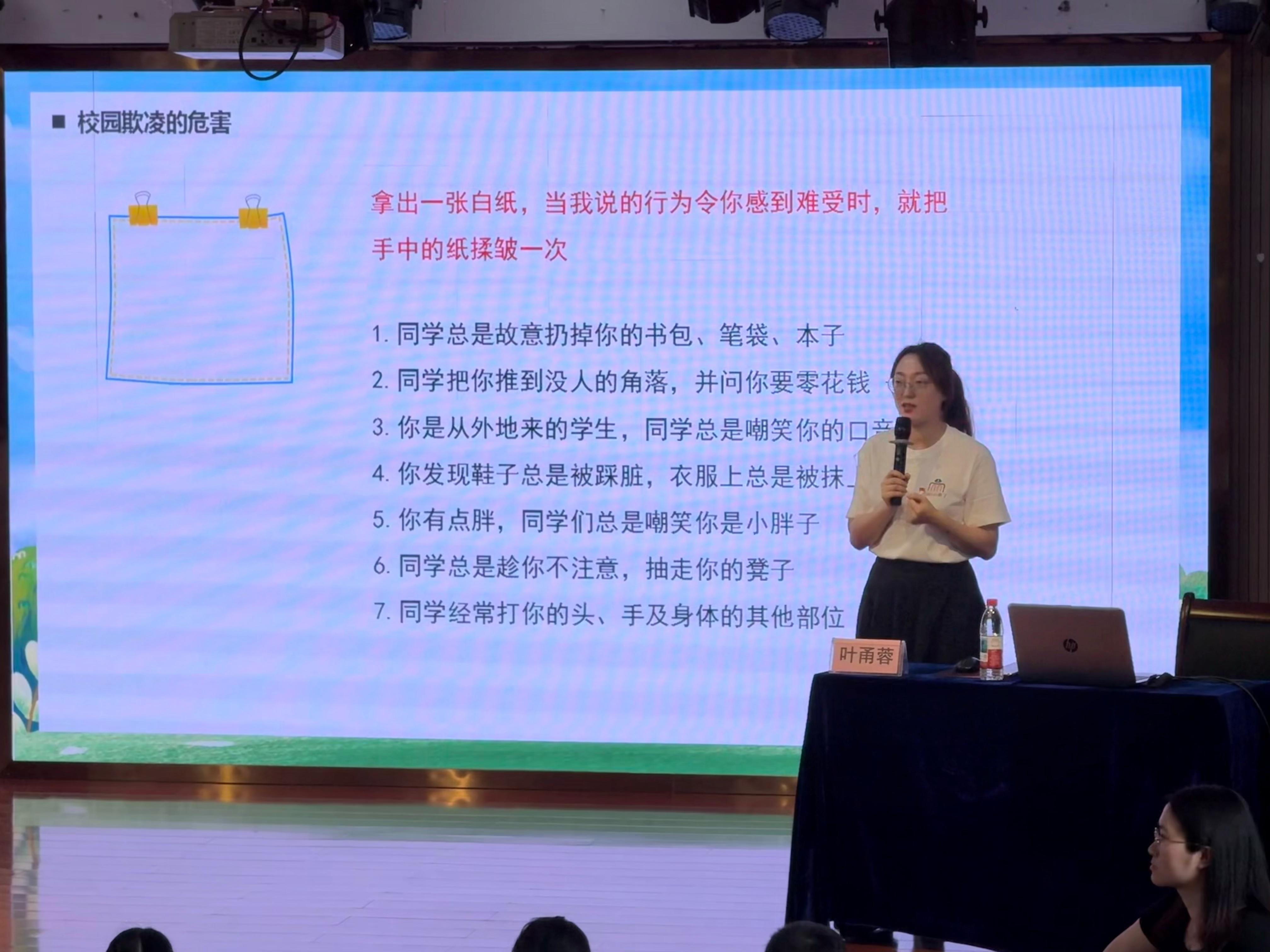 9月25日下午,鐘公廟中學(xué)420名師生也迎來了“平安第一課”。課程內(nèi)容緊扣初中生身心特點(diǎn),講師董黎娜重點(diǎn)剖析校園欺凌的表現(xiàn)形式與應(yīng)對(duì)策略,同時(shí)結(jié)合季節(jié)特點(diǎn)強(qiáng)化防溺水教育,并針對(duì)當(dāng)前高發(fā)的電信網(wǎng)絡(luò)詐騙進(jìn)行預(yù)警提示,幫助學(xué)生筑牢思想防線。9月26日,志愿團(tuán)又走進(jìn)天童小學(xué),為200余名小學(xué)生開展專題普法教育,講師葉甬蓉用通俗易懂的語言講解“什么是欺凌”“如何說不”,在孩子們心中播下法治與尊重的種子。