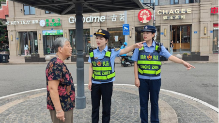 圖為女子執(zhí)法隊(duì)為游客指路