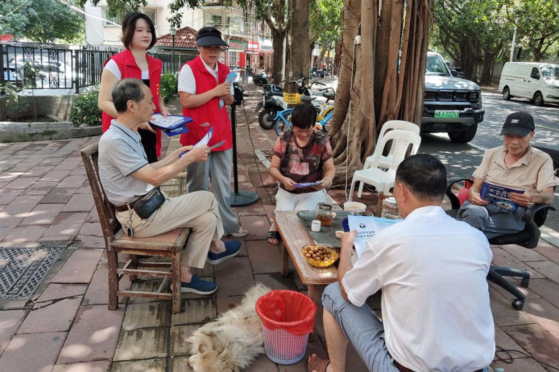 永興縣駐福州市流動(dòng)黨委工作人員正在福州市區(qū)發(fā)放禁毒防詐宣傳資料。