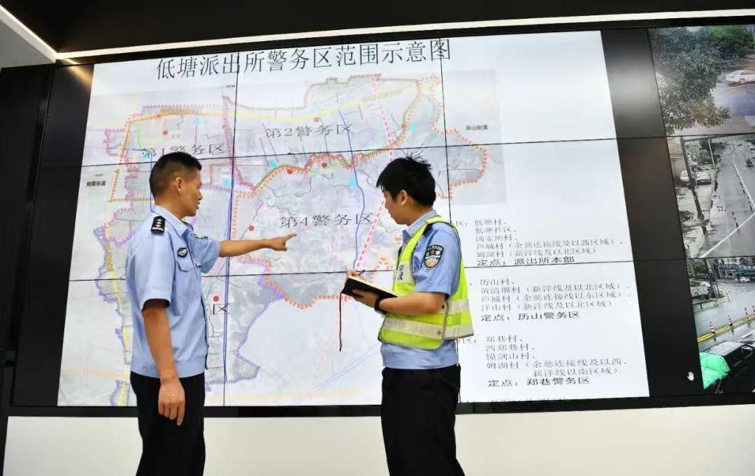 走進(jìn)低塘派出所綜合指揮室,科技感撲面而來。巨大的電子屏幕上,“指揮一張圖”清晰顯示著所有路面警力和巡邏車輛的實(shí)時位置。