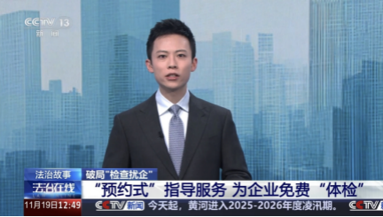 11月19日中午,CCTV13《法治在線》播出浙江省寧波市縱深推進“大綜合一體化”行政執(zhí)法改革工作,優(yōu)化營商環(huán)境,規(guī)范涉企行政檢查,加強行政檢查計劃統(tǒng)籌情況,報道了寧波市鎮(zhèn)海區(qū)九龍湖鎮(zhèn)“預約式”指導服務為企業(yè)免費“體檢”的典型做法。