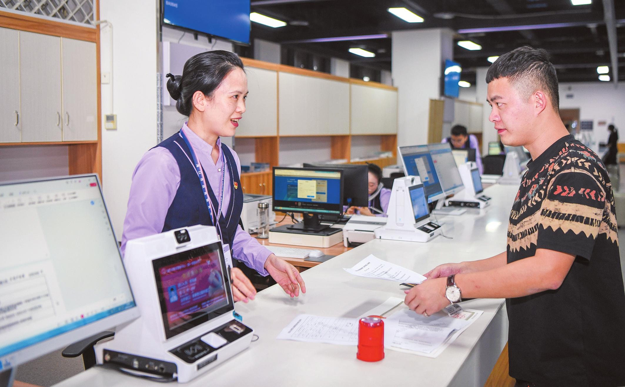 11月18日,在??谑姓?wù)服務(wù)大廳“黨員先鋒崗”前,工作人員正在為市民辦理相關(guān)業(yè)務(wù)。 記者 蘇弼坤 攝