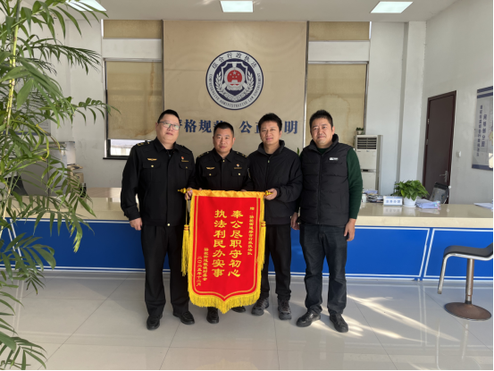 “感謝你們的真誠守護(hù),為村民排憂解難!”近日,浙江省寧波市鎮(zhèn)海區(qū)駱駝街道敬德村村委會代表攜“執(zhí)法利民辦實(shí)事 奉公盡職守初心”錦旗,向駱駝綜合行政執(zhí)法中隊(duì)送來錦旗,肯定了駱駝綜合行政執(zhí)法中隊(duì)對村委會工作的支持,并表達(dá)了對執(zhí)法中隊(duì)為民辦實(shí)事的感激之情。