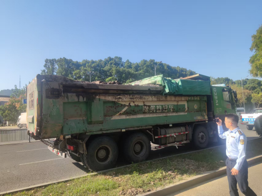 上午9時(shí)許,一輛重型自卸貨車在滸山街道西二環(huán)路右轉(zhuǎn)彎拐入慈甬路,行駛至慈甬路與西二環(huán)路交叉口往西200米處時(shí)被執(zhí)法人員叫停檢查。經(jīng)檢查,該車滿載建筑垃圾,數(shù)量約為20立方米,主要成分為渣土。該車車載裝置設(shè)備開啟,相關(guān)平臺(tái)能顯示車輛行駛軌跡,但未發(fā)現(xiàn)電子轉(zhuǎn)移聯(lián)單登記。