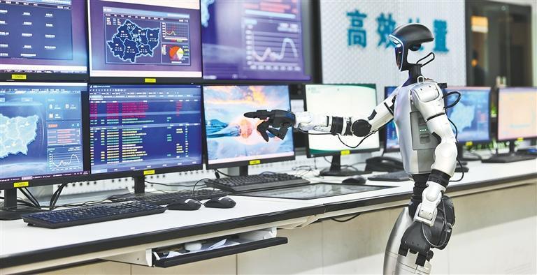 位于湖北省襄陽市的國(guó)網(wǎng)襄陽供電公司江北集控站監(jiān)控大廳內(nèi),人形機(jī)器人專注“盯屏”。它能自動(dòng)生成故障處置建議,遇到緊急情況還能自主撥打通知電話,讓事故分析從15分鐘縮短到秒級(jí),故障處置準(zhǔn)確率提升70%以上。王虎攝(中經(jīng)視覺)