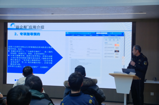 圖為執(zhí)法骨干在花園里座談會(huì)給商圈店長介紹“益企幫”應(yīng)用