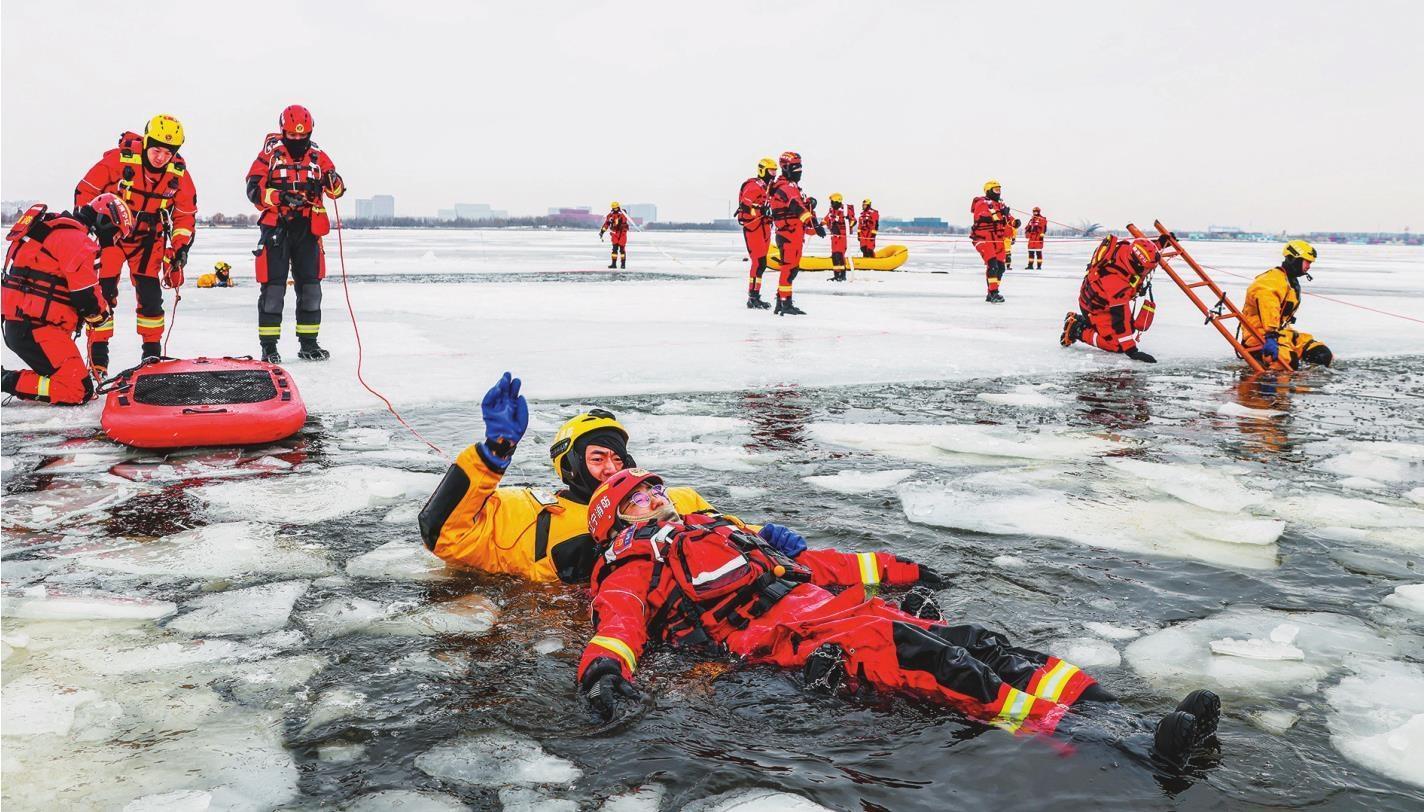 圖為消防救援人員正在開展冰上救援訓練。(記者 趙敬東 攝)