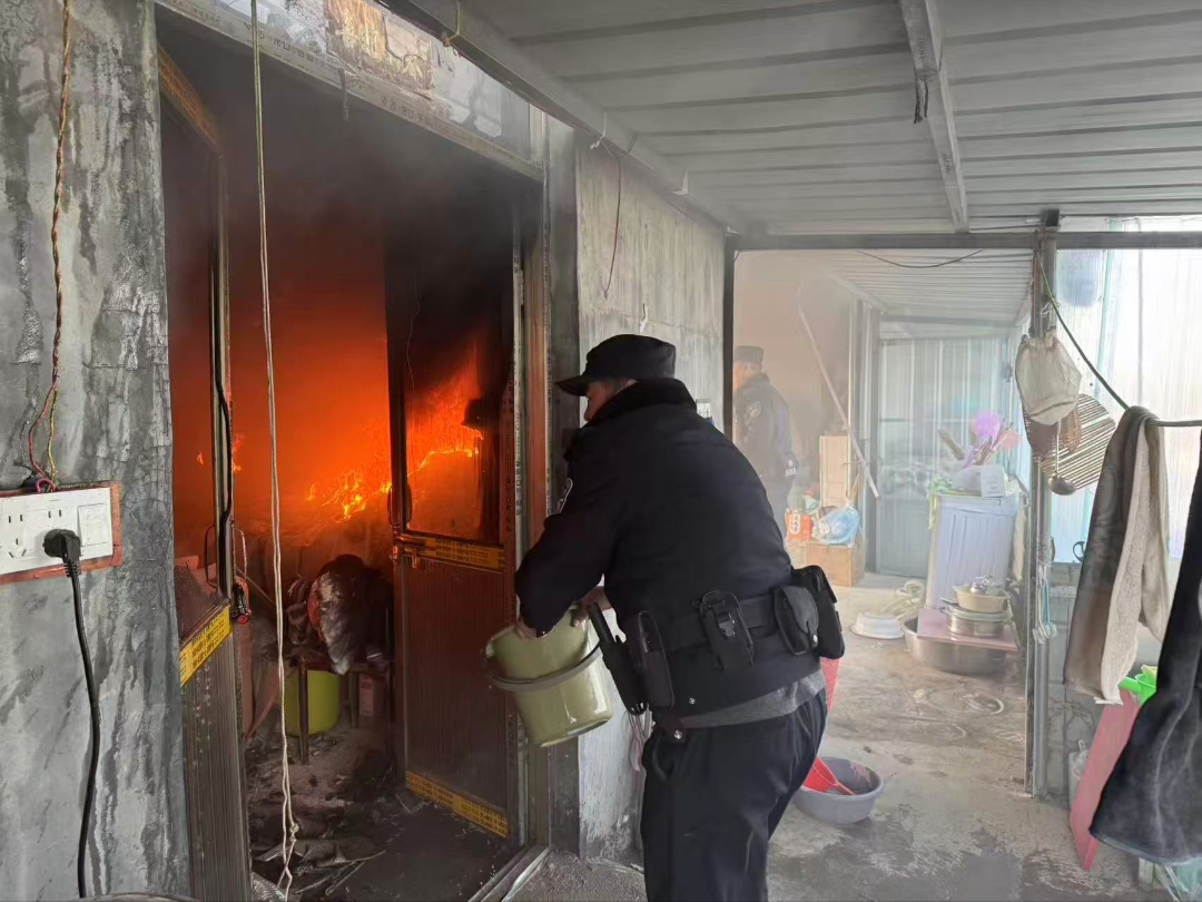 1月23日10時58分,臨清市公安局松林派出所接到群眾報警:“養(yǎng)豬場廠房起火?!被鹎榫褪敲睿拥矫詈?,民警趙力志、郭金安、張廣濱及輔警陳柏宇攜裝備火速馳援,11時04分即抵達(dá)現(xiàn)場。彼時,3間自住房烈焰沖天、濃煙滾滾,火苗已引燃路邊車輛,緊鄰的豬舍岌岌可危。