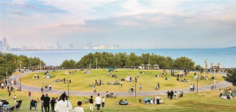 在深圳灣公園日出劇場,眾多市民陪著家人休憩游樂,共享美好假日時光。