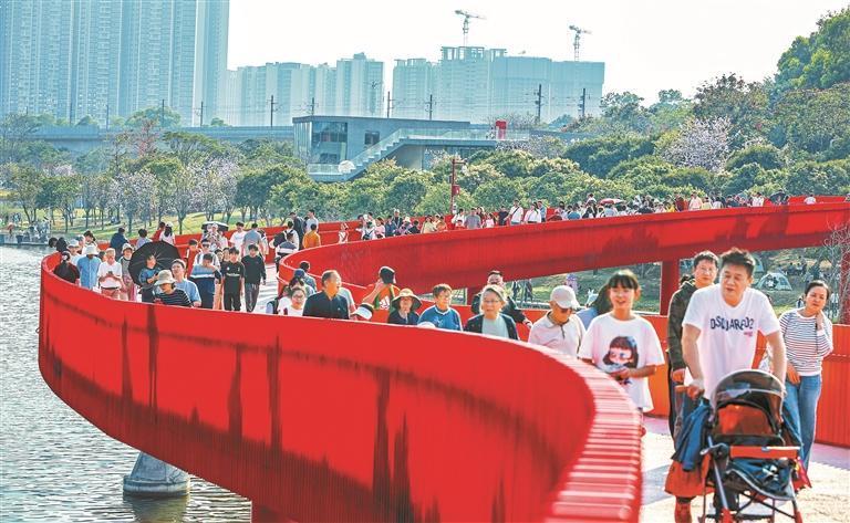 大梅沙的海浪輕撫金色沙灘,把歡笑卷進(jìn)浪花;梧桐山深處,吊鐘花已開滿山坡,人們拾級而上,穿行于青山綠水間;深圳灣的棧道上,人流與候鳥同向而行;虹橋公園里,4公里“紅飄帶”蜿蜒,行人漫步虹橋之上,祈愿新年“行鴻運(yùn)”;光明田園里,油菜花鋪成金色的海,支一頂帳篷,煮一壺清茶,歡聲笑語回蕩。