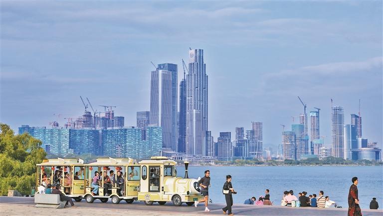 市民游客乘坐深圳灣公園觀光小火車欣賞灣區(qū)美景。
