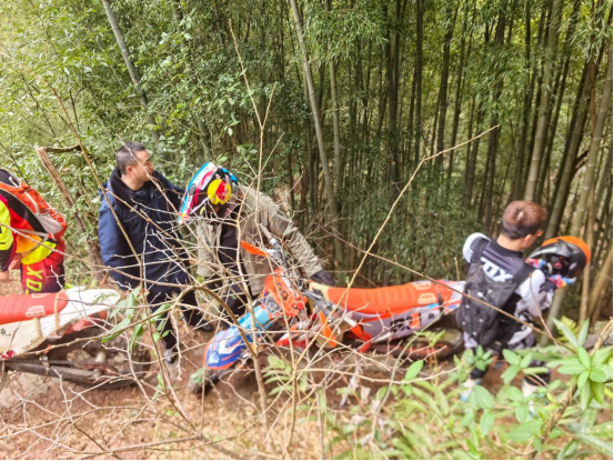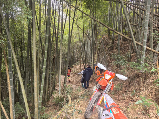 騎友們急在心頭,嘗試推車、墊土等方法脫困均無果。深山古道偏僻,無行人可求助,大家一時(shí)束手無策。就在一籌莫展之際,正在周邊開展常態(tài)化安全隱患排查的溪口鎮(zhèn)綜合行政執(zhí)法隊(duì)隊(duì)員恰好經(jīng)過??吹奖焕闆r,隊(duì)員們立即停車上前,詢問情況、查看路況,迅速投入救援。