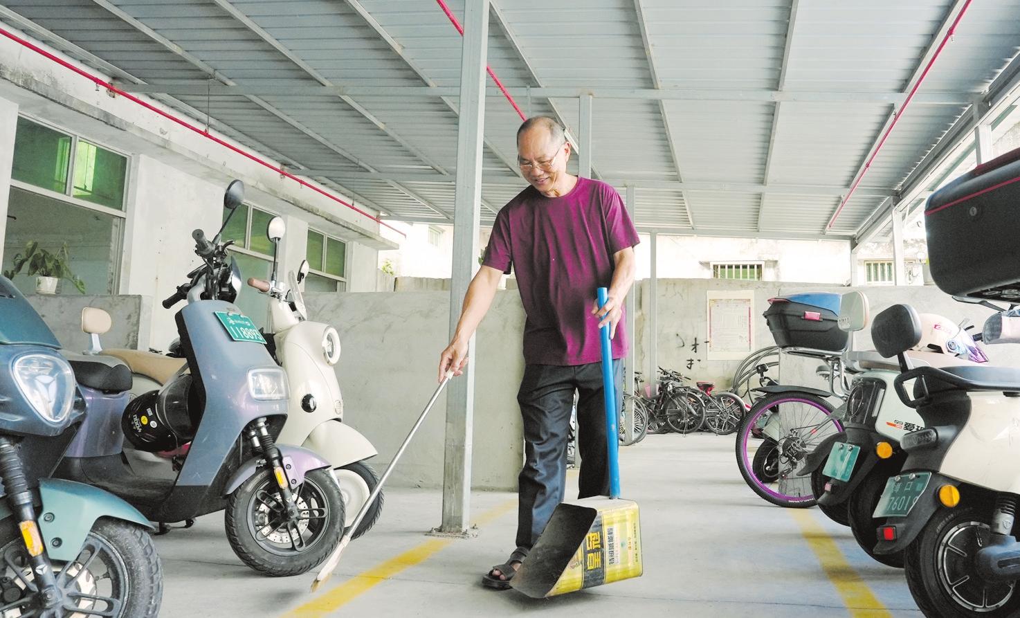 近日,在美蘭區(qū)和平南街道海潤花園小區(qū),物業(yè)工作人員正在打掃電動自行車棚衛(wèi)生。記者 楊忠凱 攝