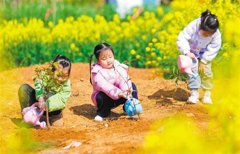 3月11日,江西省吉安市峽江縣城西幼兒園勞動(dòng)基地,小朋友在為新栽種的樹苗澆水。陳福平攝(中經(jīng)視覺)