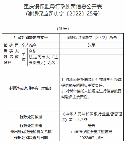 張策對新華信托向禁止性或限制性領(lǐng)域提供融資問題負主要責任、對新華信托未按規(guī)定進行信息披露問題負主要責任。依據(jù)《中華人民共和國銀行業(yè)監(jiān)督管理法》第四十八條,中國銀保監(jiān)會重慶監(jiān)管局對其警告。