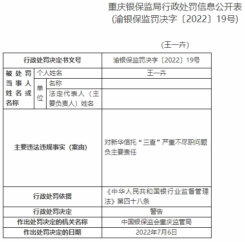 王一卉對新華信托“三查”嚴重不盡職問題負主要責任。依據(jù)《中華人民共和國銀行業(yè)監(jiān)督管理法》第四十八條,中國銀保監(jiān)會重慶監(jiān)管局對其警告。