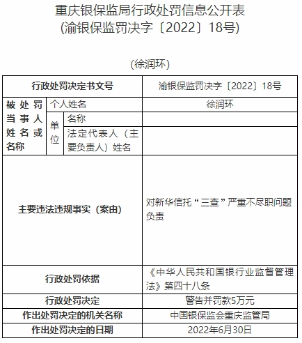 徐潤環(huán)對新華信托“三查”嚴重不盡職問題負責。依據(jù)《中華人民共和國銀行業(yè)監(jiān)督管理法》第四十八條,中國銀保監(jiān)會重慶監(jiān)管局對其警告并罰款5萬元。