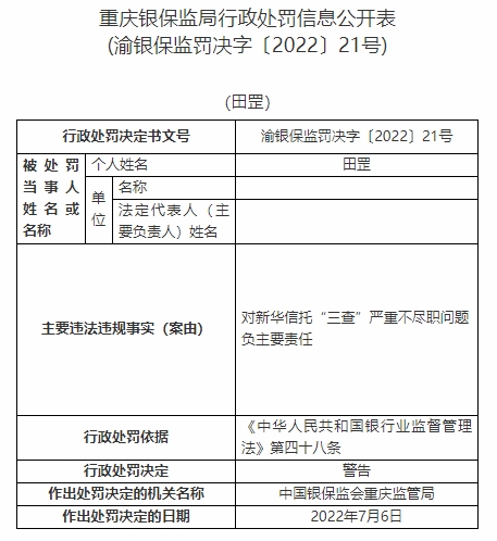 田罡對新華信托“三查”嚴重不盡職問題負主要責任。依據(jù)《中華人民共和國銀行業(yè)監(jiān)督管理法》第四十八條,中國銀保監(jiān)會重慶監(jiān)管局對其警告。