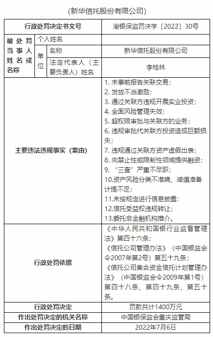 銀保監(jiān)會網(wǎng)站今日公布了重慶銀保監(jiān)局行政處罰信息公開表(渝銀保監(jiān)罰決字〔2022〕30號、16號、18號、19號、20號、21號、22號、23號、24號、25號、26號、27號、28號、29號、31號、32號)顯示,新華信托股份有限公司存在13宗主要違法違規(guī)事實:未事前報告關(guān)聯(lián)交易;發(fā)放不當激勵;通過關(guān)聯(lián)方違規(guī)開展實業(yè)投資;全面風險管理失效;超權(quán)限審批與關(guān)聯(lián)方的業(yè)務(wù);違規(guī)審批代關(guān)聯(lián)方投資造成巨額損失;違規(guī)通過關(guān)聯(lián)方資產(chǎn)虛假出表;向禁止性或限制性領(lǐng)域提供融資;“三查”嚴重不盡職;資產(chǎn)風險分類不準確、減值準備計提不足;未按規(guī)定進行信息披露;信托受益權(quán)違規(guī)轉(zhuǎn)讓;委托非金融機構(gòu)推介。