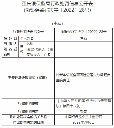 李荻對新華信托全面風險管理失效問題負直接責任。依據(jù)《中華人民共和國銀行業(yè)監(jiān)督管理法》第四十八條,中國銀保監(jiān)會重慶監(jiān)管局對其警告。