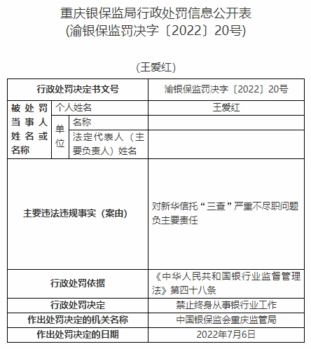 王愛紅對新華信托“三查”嚴重不盡職問題負主要責任。依據(jù)《中華人民共和國銀行業(yè)監(jiān)督管理法》第四十八條,中國銀保監(jiān)會重慶監(jiān)管局對其禁止終身從事銀行業(yè)工作。