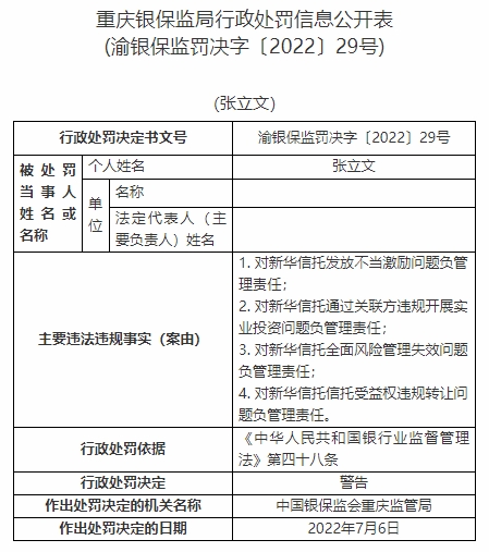 張立文對新華信托發(fā)放不當激勵問題負管理責任、對新華信托通過關(guān)聯(lián)方違規(guī)開展實業(yè)投資問題負管理責任、對新華信托全面風險管理失效問題負管理責任、對新華信托信托受益權(quán)違規(guī)轉(zhuǎn)讓問題負管理責任。依據(jù)《中華人民共和國銀行業(yè)監(jiān)督管理法》第四十八條,中國銀保監(jiān)會重慶監(jiān)管局對其警告。