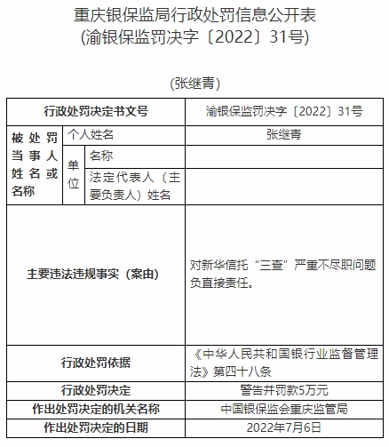 張繼青對新華信托“三查”嚴重不盡職問題負直接責任。依據(jù)《中華人民共和國銀行業(yè)監(jiān)督管理法》第四十八條,中國銀保監(jiān)會重慶監(jiān)管局對其警告并罰款5萬元。