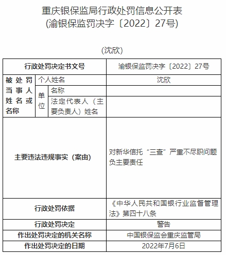 沈欣對新華信托“三查”嚴重不盡職問題負主要責任。依據(jù)《中華人民共和國銀行業(yè)監(jiān)督管理法》第四十八條,中國銀保監(jiān)會重慶監(jiān)管局對其警告。