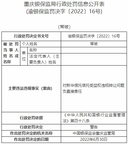 常坡對新華信托信托受益權(quán)違規(guī)轉(zhuǎn)讓問題負直接責任。依據(jù)《中華人民共和國銀行業(yè)監(jiān)督管理法》第四十八條,中國銀保監(jiān)會重慶監(jiān)管局對其警告。