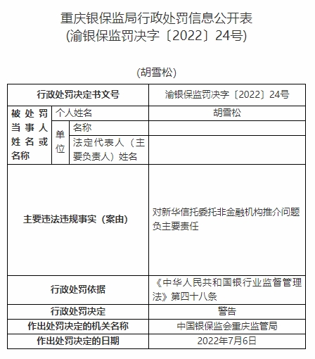 胡雪松對新華信托委托非金融機構(gòu)推介問題負主要責任。依據(jù)《中華人民共和國銀行業(yè)監(jiān)督管理法》第四十八條,中國銀保監(jiān)會重慶監(jiān)管局對其警告。