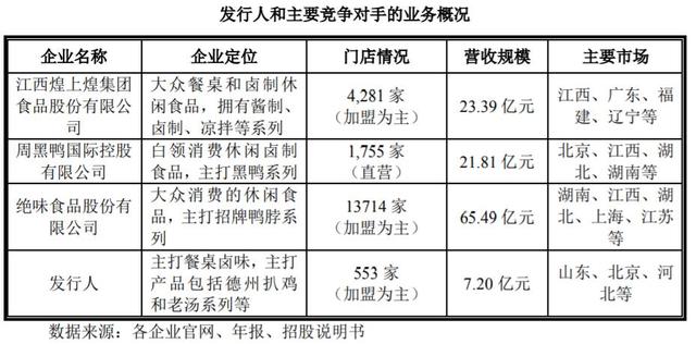 在招股書中,德州扒雞將休閑鹵制品企業(yè)煌上煌、周黑鴨、絕味食品列為行業(yè)內(nèi)主要競爭對手。需要注意的是,不論是營收規(guī)模還是門店數(shù)量,德州扒雞都遠(yuǎn)不及這些競爭對手。