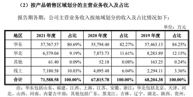 從區(qū)域收入分布來看,德州扒雞的營業(yè)收入主要來源于華東和華北地區(qū)。招股書顯示,2019年至2021年,德州扒雞在華東地區(qū)的收入占比分別為84.25%、82.27%、80.69%;在華北地區(qū)收入占比分別為12.15%、11.61%、9.19%;其他地區(qū)收入占比不足1%。