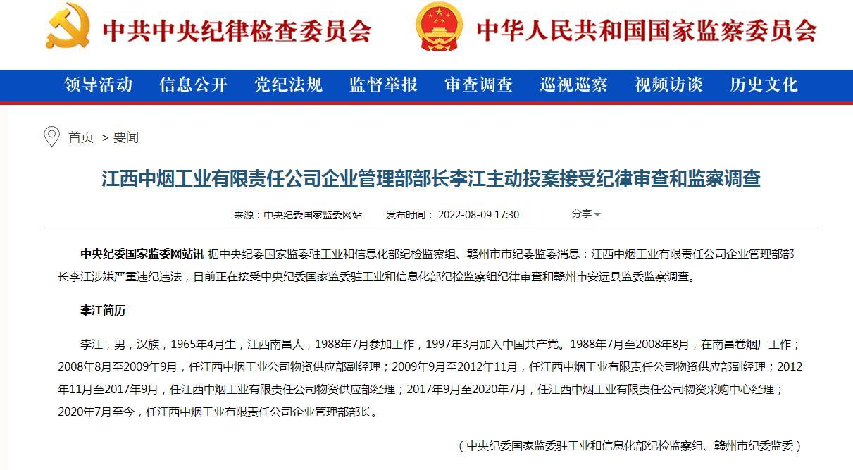 江西中煙工業(yè)有限責(zé)任公司企業(yè)管理部部長李江主動投案接受紀(jì)律審查和監(jiān)察調(diào)查