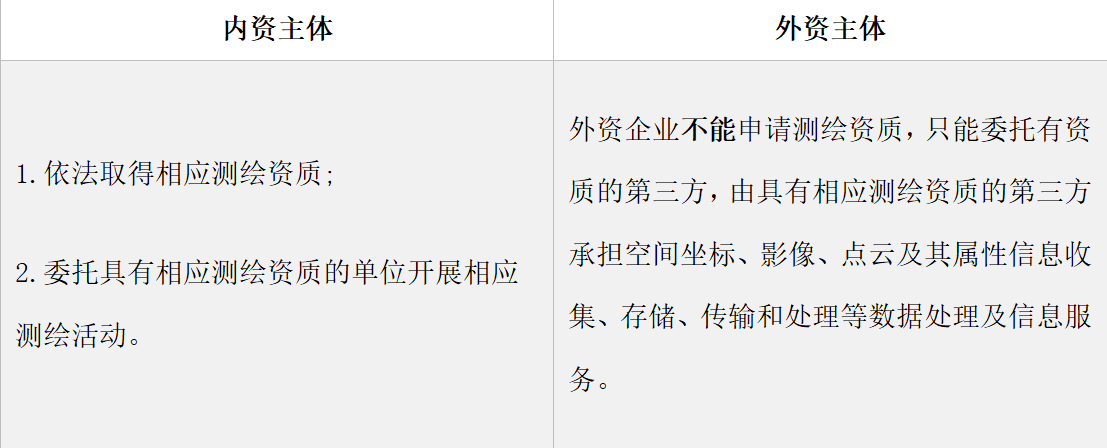 答:《通知》第三條規(guī)定:“需要從事相關(guān)數(shù)據(jù)收集、存儲、傳輸和處理的車企、服務(wù)商及智能駕駛軟件提供商等,屬于內(nèi)資企業(yè)的,應(yīng)依法取得相應(yīng)測繪資質(zhì),或委托具有相應(yīng)測繪資質(zhì)的單位開展相應(yīng)測繪活動;屬于外商投資企業(yè)的,應(yīng)委托具有相應(yīng)測繪資質(zhì)的單位開展相應(yīng)測繪活動,由被委托的測繪資質(zhì)單位承擔(dān)收集、存儲、傳輸和處理相關(guān)空間坐標(biāo)、影像、點云及其屬性信息等業(yè)務(wù)及提供地理信息服務(wù)與支持。