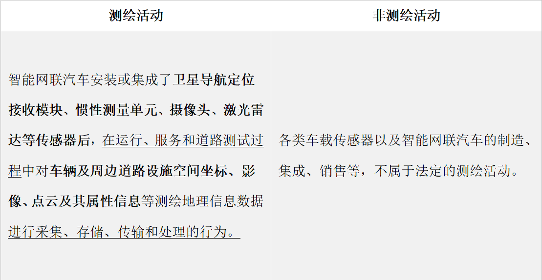 答:《通知》采用列舉的方式,明確了測繪活動及非測繪活動的含義,簡而言之:測繪活動是通過車載傳感器設(shè)備,在運行服務(wù)中,對車輛及周邊坐標(biāo)、影像、點云及屬性信息的相關(guān)處理活動。而制造、銷售、集成等不涉及信息采集的活動則不屬于測繪活動。