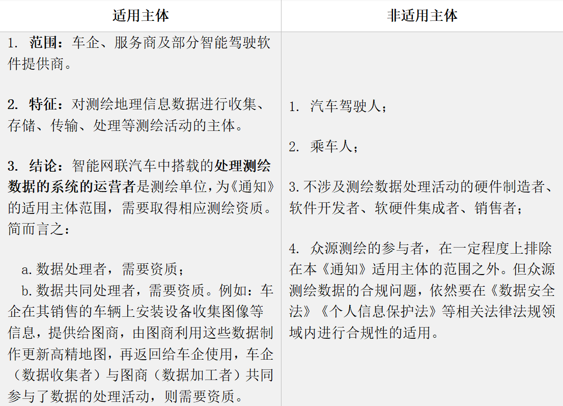按照目前的市場情況來看,《通知》規(guī)范的主體主要為車企、服務(wù)商及部分智能駕駛軟件提供商,而對于僅獲得輔助駕駛等服務(wù)的智能網(wǎng)聯(lián)汽車駕乘人員,則不屬于有關(guān)測繪活動的行為人。