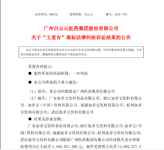 據(jù)廣藥集團子公司白云山2018年7月公告,廣東高院關(guān)于“王老吉”商標法律糾紛案件的一審《民事判決書》顯示,廣東加多寶飲料食品有限公司、浙江加多寶飲料有限公司、加多寶(中國)飲料有限公司、福建加多寶飲料有限公司、杭州加多寶飲料有限公司、武漢加多寶飲料有限公司(合稱為“六加多寶”)被判賠償廣藥集團經(jīng)濟損失及合理維權(quán)費用共計人民幣14.41億元。