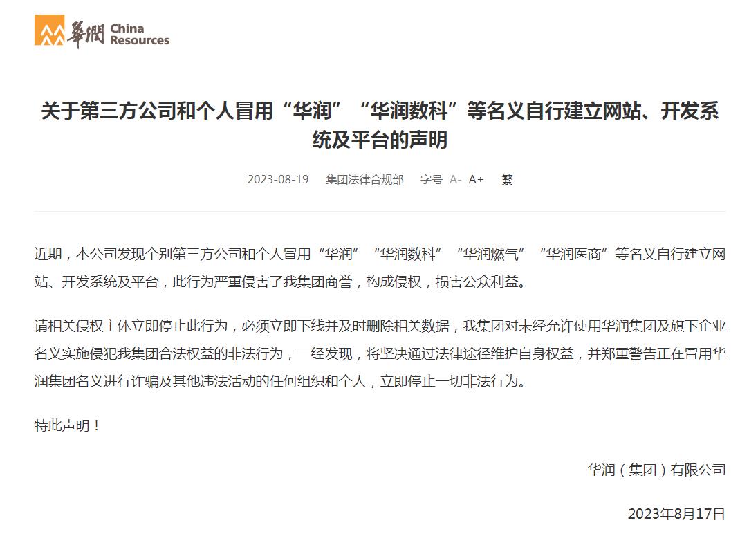 華潤(集團)有限公司(以下簡稱“華潤集團”)的聲明稱,近期,公司發(fā)現(xiàn)個別第三方公司和個人冒用“華潤”“華潤數(shù)科”“華潤燃氣”“華潤醫(yī)商”等名義自行建立網(wǎng)站、開發(fā)系統(tǒng)及平臺,此行為嚴(yán)重侵害了華潤集團商譽,構(gòu)成侵權(quán),損害公眾利益。