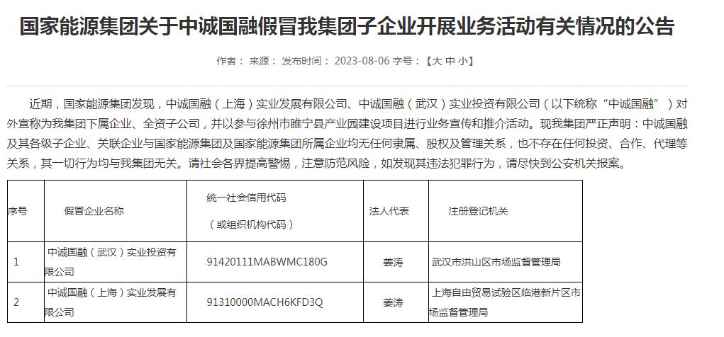 8月6日,國家能源集團發(fā)布了關(guān)于中誠國融假冒集團子企業(yè)開展業(yè)務(wù)活動有關(guān)情況的公告。