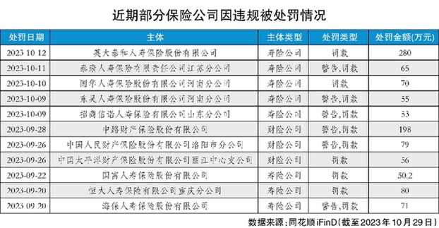 同花順數(shù)據(jù)顯示,以處罰日期作為統(tǒng)計依據(jù),截至10月29日記者發(fā)稿,今年下半年以來,各類主管機關(guān)共對約500家次保險公司的違規(guī)行為作出處罰,處罰金額達1.02億元。合計處罰次數(shù)、合計處罰金額兩項指標較去年同期均呈上升趨勢。