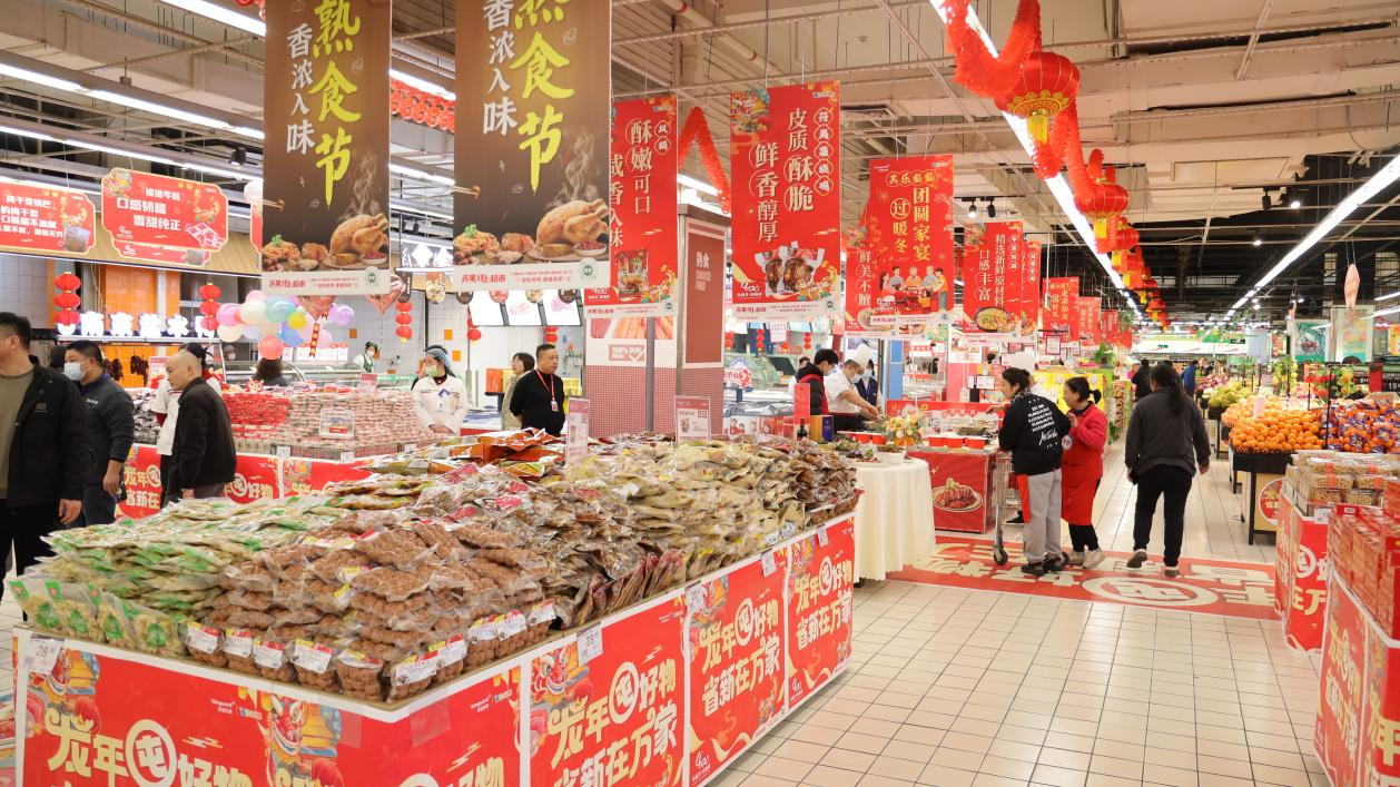在蘇果南京將軍大道店,喜氣洋洋的龍年年貨節(jié)海報(bào)、吊旗裝飾了整個(gè)賣場,各式休閑食品、酒水、牛奶酒水禮盒,鮮活的水產(chǎn)、新鮮的果蔬、來自全國各地的土特產(chǎn)、龍年飾品、吉祥物等琳瑯滿目,蘇果超市“年貨節(jié)”呈現(xiàn)一片紅火和欣欣向榮的熱鬧景象。不少消費(fèi)者推著購物車提前選購心儀的年貨和伴手禮?!懊磕甑倪@個(gè)時(shí)候家里都會提前備年貨和福字紅包等年節(jié)商品,錯開節(jié)前一周的購買高峰?!笔忻裰馨⒁瘫硎?。