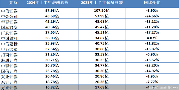 具體來看,券商“一哥”中信證券薪酬總額遙遙領(lǐng)先,上半年相關(guān)數(shù)據(jù)為97.93億元,但相較之下,中信證券2023年上半年薪酬總額則超百億,為107.5億元,同比減少8.9%。