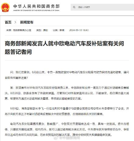 問(wèn):我們注意到,6月份以來(lái),中方一直就歐盟對(duì)華電動(dòng)汽車反補(bǔ)貼案與歐方保持溝通和磋商,請(qǐng)問(wèn)目前有何最新進(jìn)展?