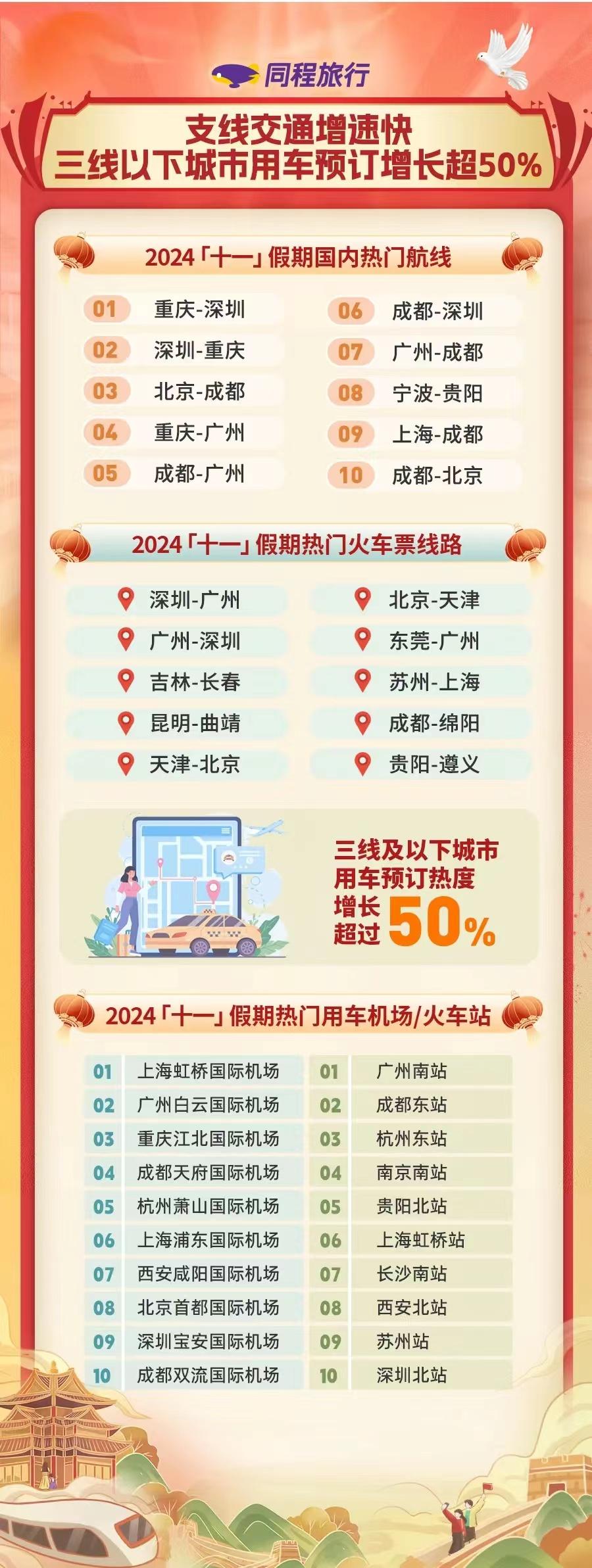 民航方面,今年“十一”假期,成渝地區(qū)往返長三角、珠三角的航線較為熱門,同時不少非樞紐機(jī)場的航班預(yù)訂量同比增長迅速,價格也有所上浮。10月1日和7日的高峰時段,部分核心城市前往支線機(jī)場的全價經(jīng)濟(jì)艙也“一票難求”。同程研究院分析認(rèn)為,越來越多的城市居民在假期前往低線城市和小眾旅游目的地,而這些航線短期供給增速低于需求增速,導(dǎo)致票價上漲和票量緊張。
